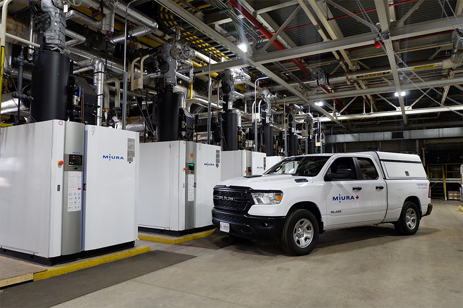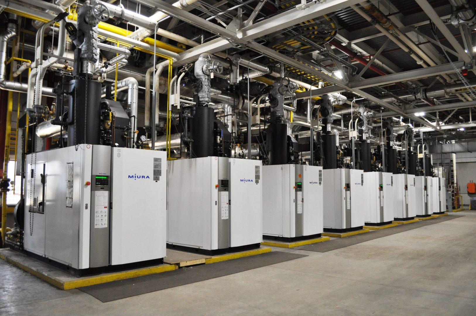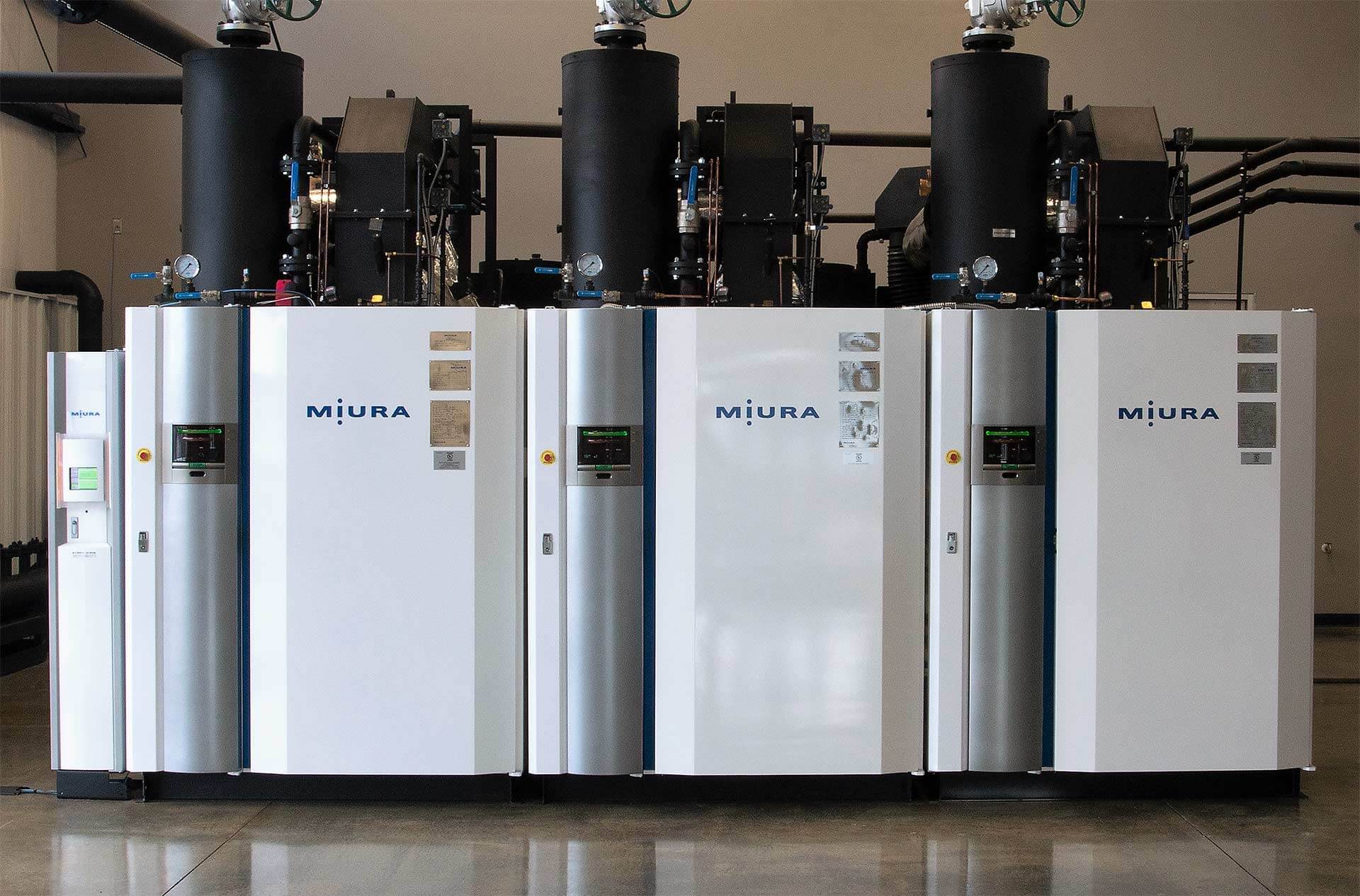 Many facilities take advantage of Miura’s modular boiler systems to fit more lower powered units into the footprint of a large traditional boiler, working in chorus and controlled seamlessly as an MI System. In an MI configuration, the Multiple Installation (MI) System’s master controller intelligently controls all connected boilers to ensure coordinated operation, meeting the required steam load while optimizing efficiency, response time, and boiler longevity.